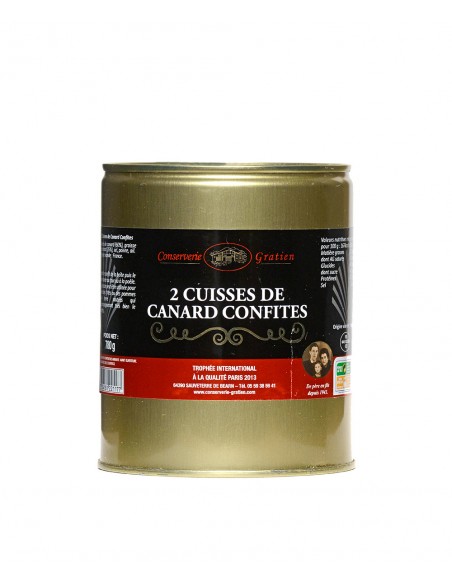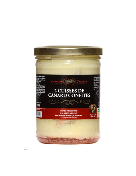 Découvrez nos deux cuisses de canard confites, un véritable incontournable de la gastronomie du Sud-Ouest. Élaborées à l’ancienne, ces cuisses sont soigneusement confites dans leur propre graisse, selon un savoir-faire artisanal, à partir de canards rigoureusement sélectionnés pour leur qualité et leur tendreté.